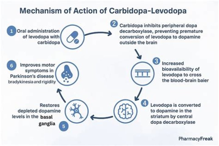 Levodopa changes into dopamine in the brain, helping to control movement. Carbidopa prevents the breakdown of levodopa in the bloodstream so more levodopa can enter the brain. Carbidopa can also reduce some of levodopa’s side effects such as nausea and vomiting.