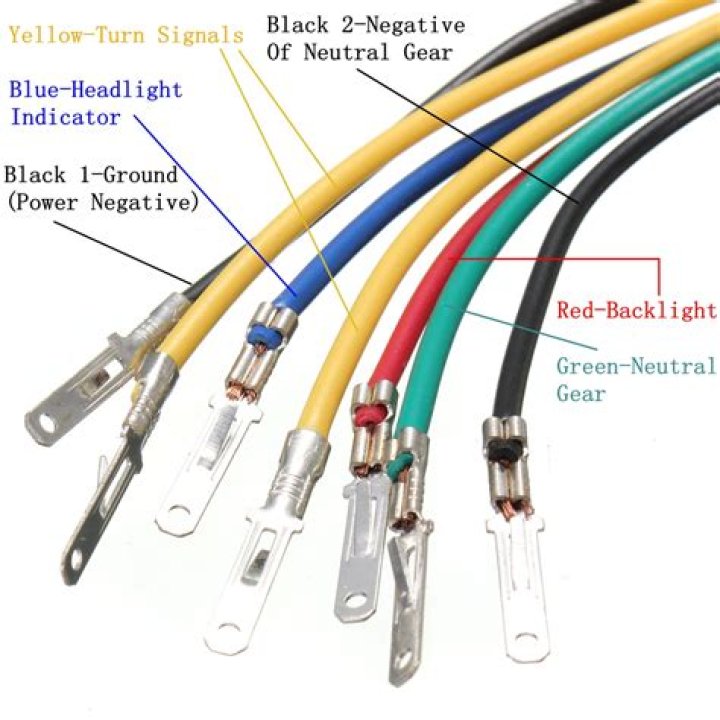 The green wire is the right turn/brake, the yellow wire is the left turn/brake, the white wire is the ground, and the brown wire is the electric wire. It is best to wire by function as wire colors can vary.