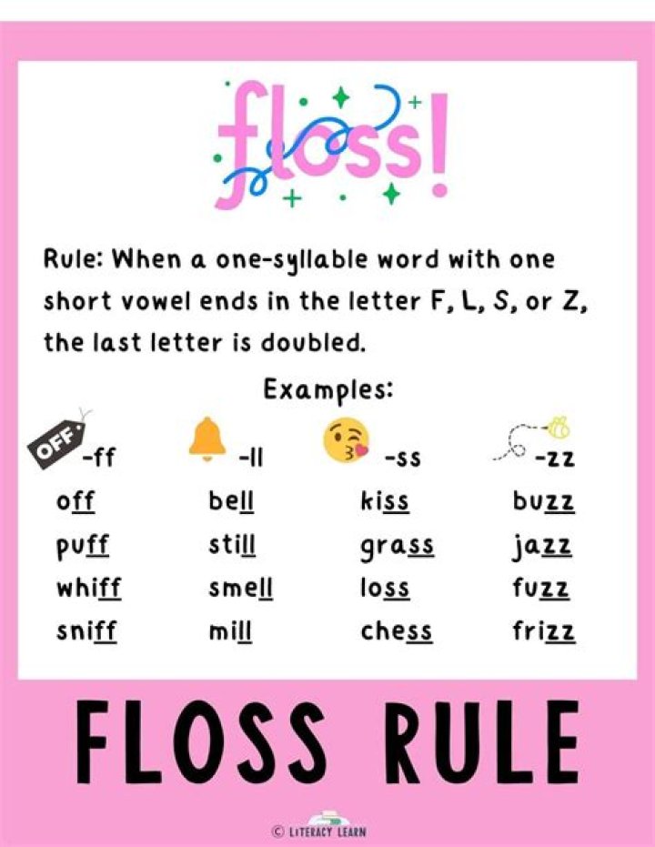 How do you explain the floss rule? When a one-syllable words ends in f, l, or s, double the final f, l, or s (for example, snif, fall, mess). We call this...