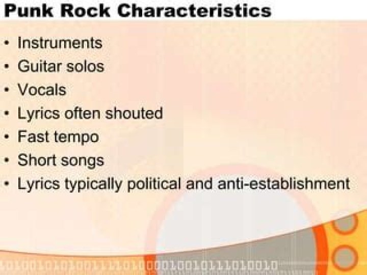 What are 3 characteristics of punk rock? Punk rock is characterized by fast tempos, loud and distorted riffs, simple songs, frequent use of power chords, ...
