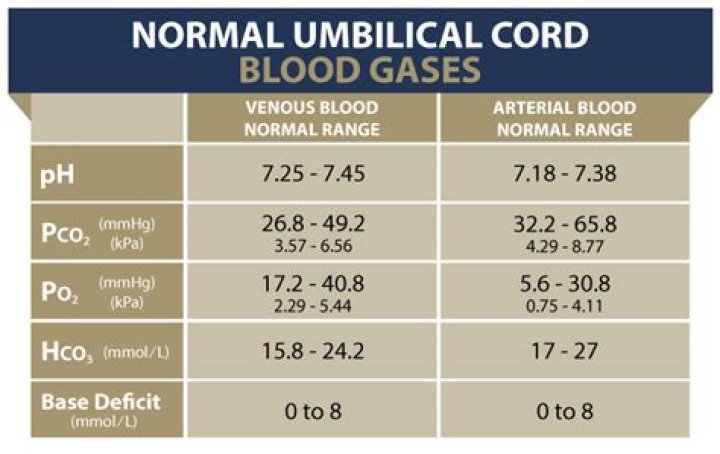 What are normal Cord gas values? Normal arterial cord blood gases for a term newborn: pH: 7.18 – 7.38. PCO2: 32 – 66 (mmHg) HCO3-: 17 – 27 (mmol/L) PO2: 6...